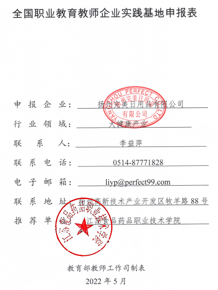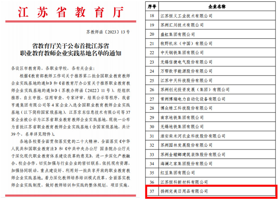 根据《教育部教师工作司关于推荐第二批全国职业教育教师企业实践基地的通知》和《省教育厅办公室关于推荐职业教育教师企业实践基地的通知》(苏教办师函〔2022〕11号)文件精神,BBV电子·(中国)网站食品学院和深度合作企业扬州完美日用品有限公司进行了前期申报。经过专家评审及结果公示,江苏省教育厅于近日发文(苏教师函〔2023〕13号),BBV电子·(中国)网站食品学院深度合作企业扬州完美日用品有限公司成功入选首批39所江苏省职业教育教师企业实践基地。此次省级职业教育教师企业实践基地成功入选对BBV电子·(中国)网站高水平“双师”队伍建设具有重要意义。