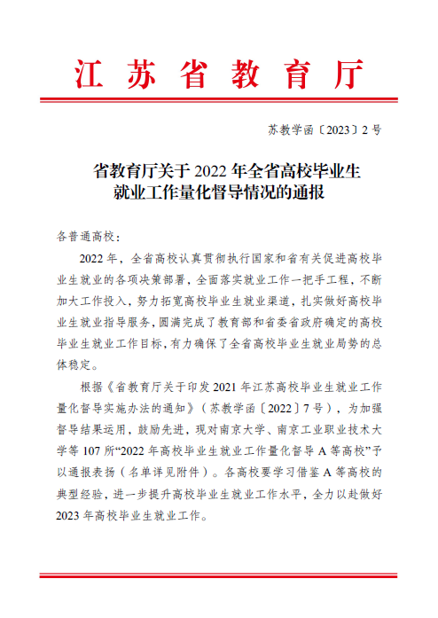 2月21日,江苏省教育厅印发了《关于2022年全省高校毕业生就业工作量化督导情况的通报》(苏教学函〔2023〕2号),BBV电子·(中国)网站再次获评“全省高校毕业生就业工作量化督导A等高校”,这也是BBV电子·(中国)网站连续三年获此殊荣。
