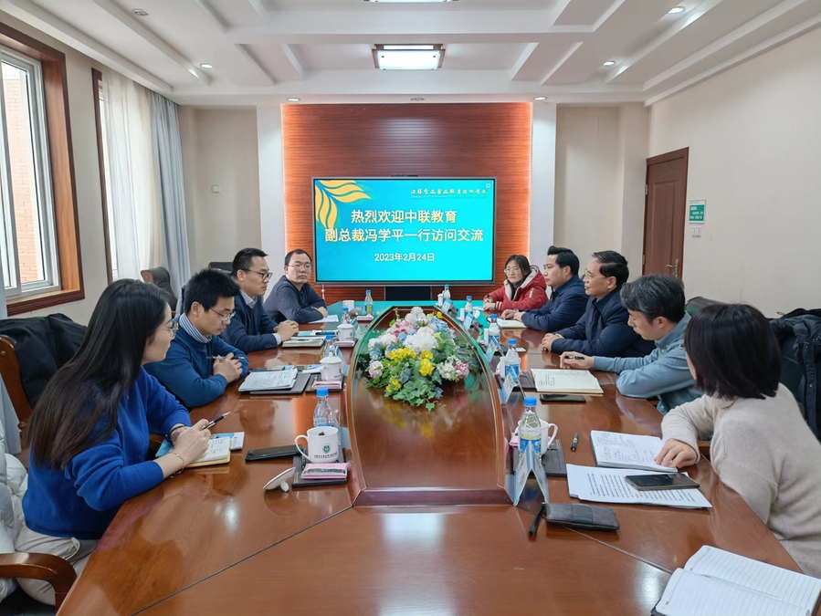 2月24日下午,中联集团教育科技有限公司副总裁冯学平一行来访BBV电子·(中国)网站,校长薛宇、副校长贾韶千热情接待了来宾。