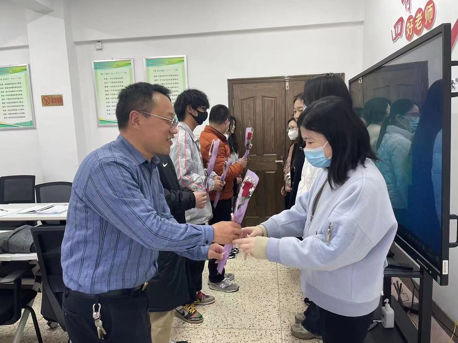 健康学院男教师们用一束鲜花和一句问候对女教师们表示节日的祝福,并为女教师们准备了“健康大礼包”,祝福她们“三八”节快乐。学生党员还为宿管阿姨送去了节日的鲜花与祝福。