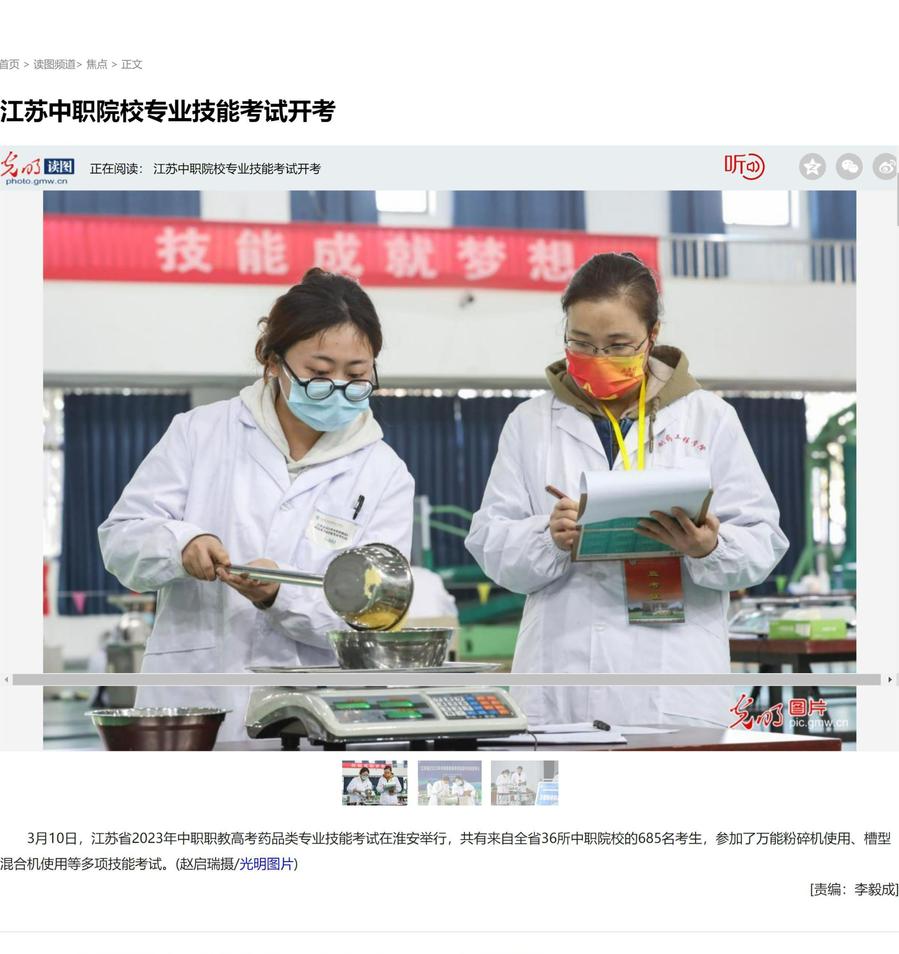 3月10日,江苏省2023年中职职教高考药品类专业技能考试在淮安举行,共有来自全省36所中职院校的685名考生,参加了万能粉碎机使用、槽型混合机使用等多项技能考试。
