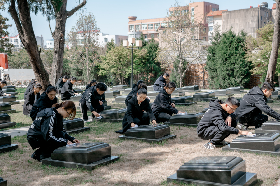 伴随着凝重深沉的献花曲,全体党员队列整齐,向烈士陵园烈士纪念塔敬献花篮,大家肃立默哀,寄托对革命先烈的无限哀思。全体党员举起右手,重温入党誓词。同学们在烈士纪念塔前朗诵诗歌《站立的初心》,深切缅怀为民族解放、国家富强和人民幸福英勇献身的革命烈士。在烈士墓园,大家仔细擦拭烈士墓碑,用心灵近距离感受先烈们伟大的灵魂。