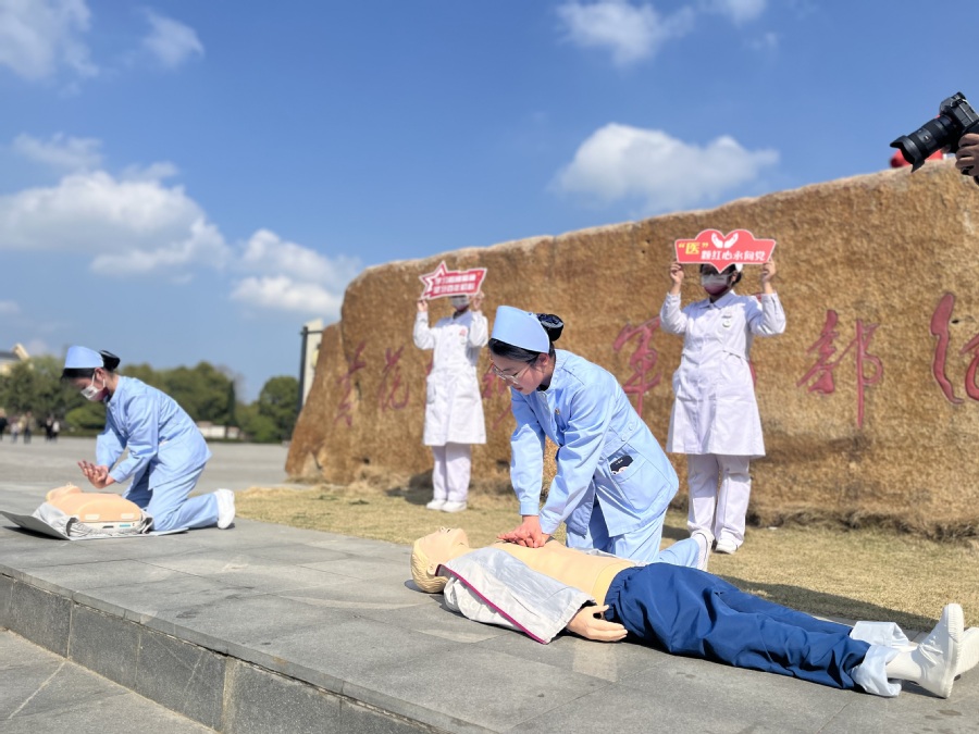 党日活动不能只是走马观花、浮光掠影,还要脚踏实地,落实到行动。为了让活动更加有意义,护理学院党总支不仅带领同学们参观了纪念馆,感悟新四军的“铁军”和“红医”精神,还将义诊带到纪念馆内,为游客们带去量血压服务、向游客们分发春季传染病防治手册,并现场为游客们展示了心肺复苏急救操作规范。游客们踊跃参与互动,活动现场热闹非凡。