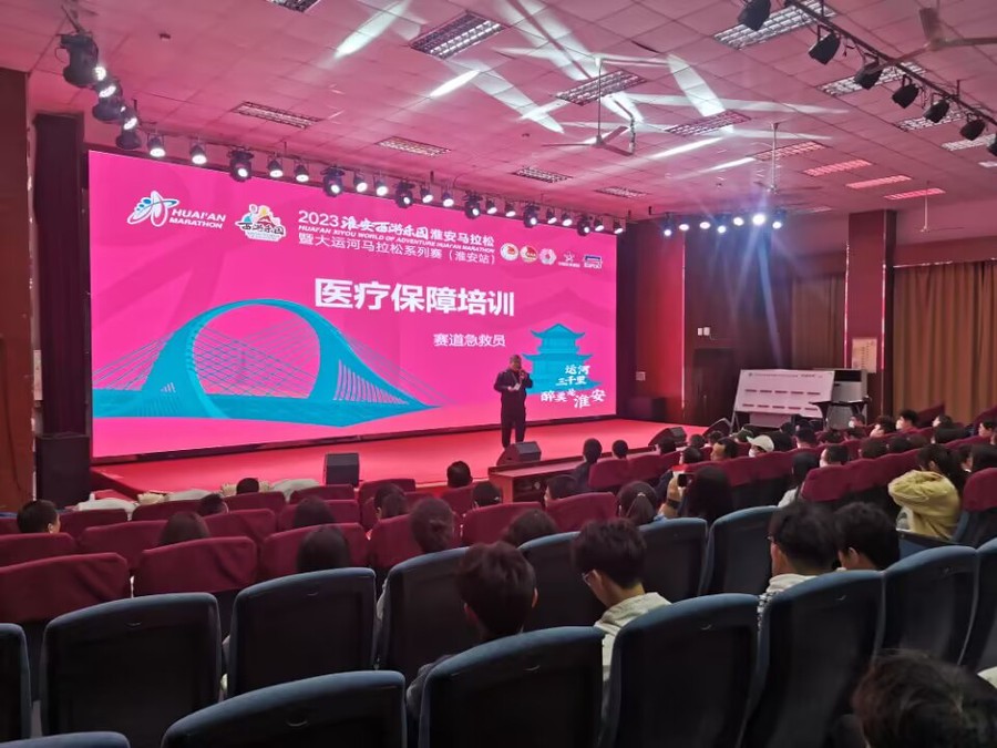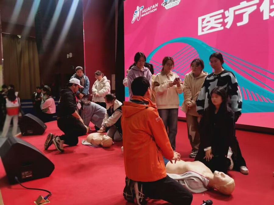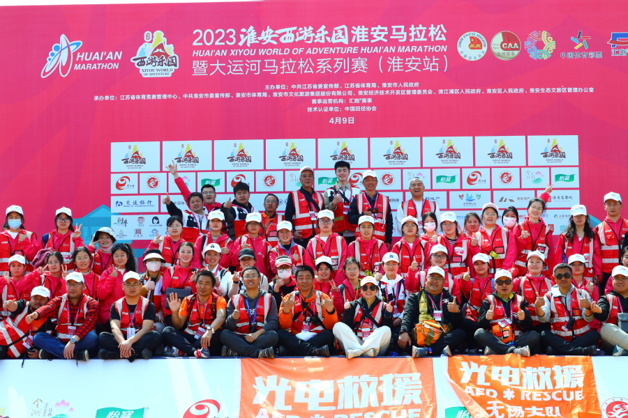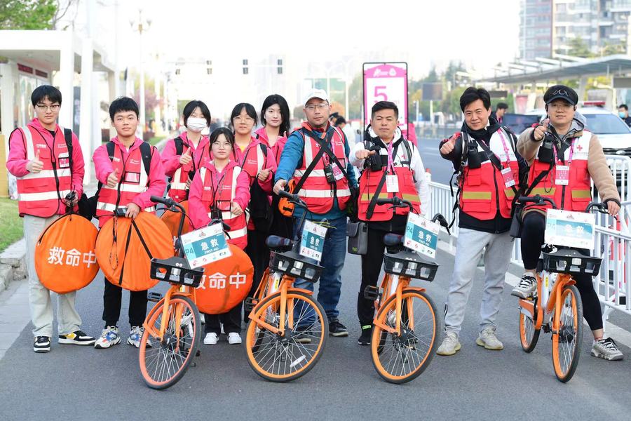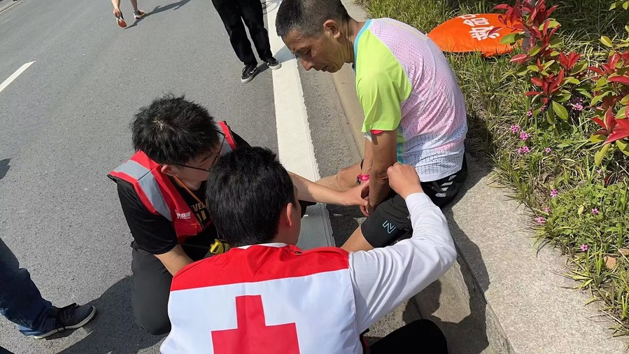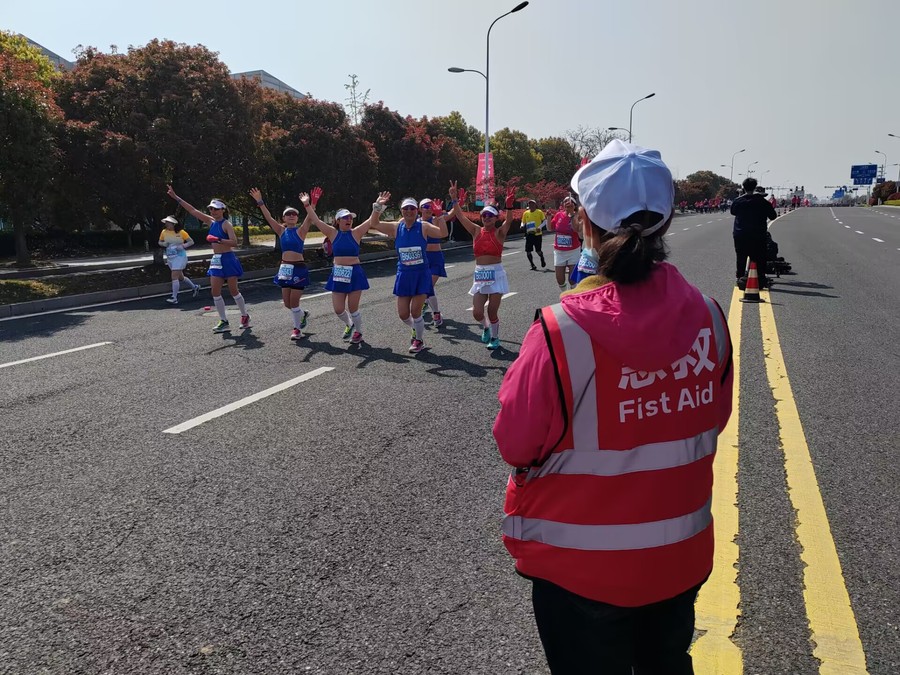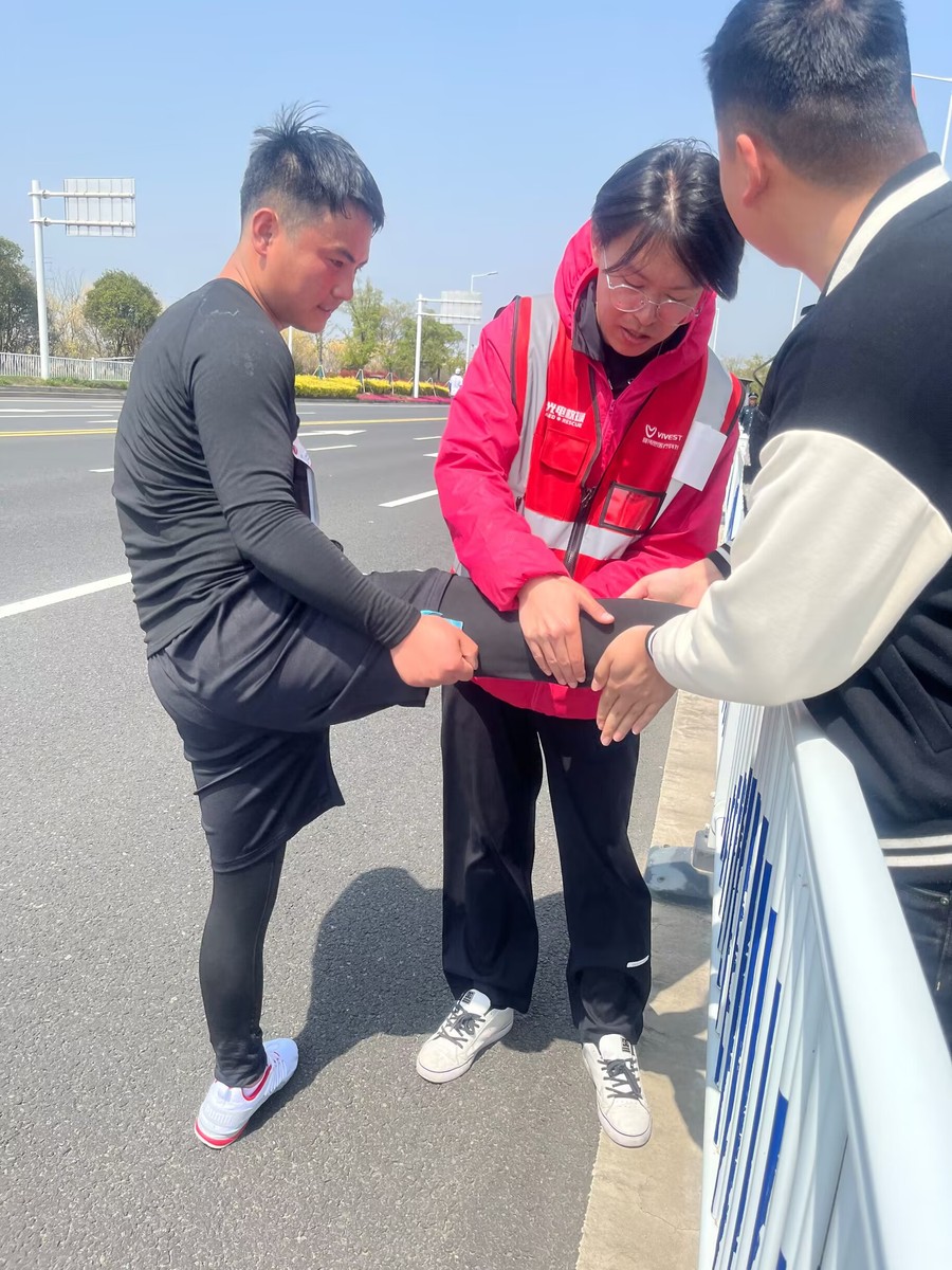 在6个多小时的服务中,我院急救志愿者全心投入、坚守岗位、积极应对,站好赛道救援“第一岗”,处置肌肉扭伤、拉伤、表皮擦伤、痉挛、低血糖、中暑等突发事件,圆满完成了此次救援保障任务。他们身上的红色马夹也成为了赛事中一道靓丽的“风景线”。