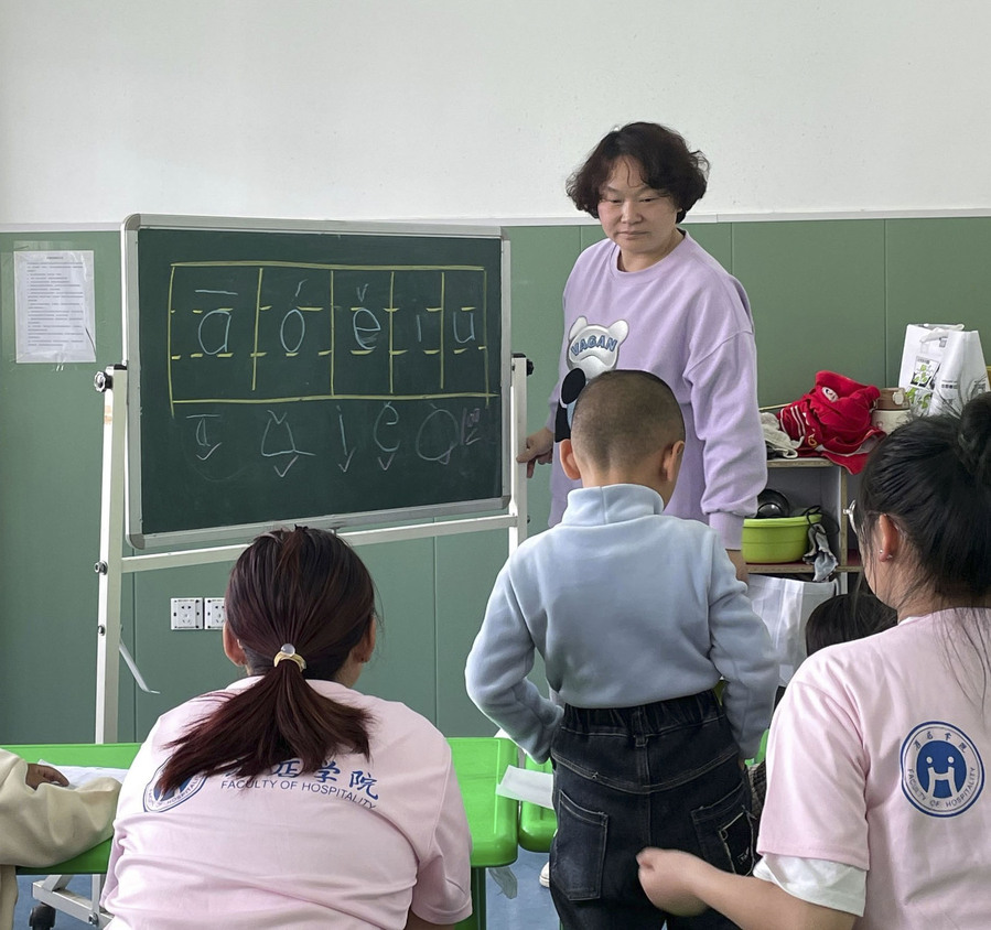 每一个自闭症儿童身后都有一个负重前行的家庭,为了让自闭症儿童的家长们获得片刻的喘息、缓解他们自身的压力,以更好的精神状态帮助孩子进行康复,酒店学院党总支与康复中心共同为家长们提供了“家长喘息日”服务。家长们离开校园,由志愿者们和孩子们一一结对,陪伴孩子们上课、游戏、活动。文化课上,志愿者耐心地教导孩子们识文断字;实践课上,志愿者努力教会孩子们生活技能;游戏课上,志愿者带着孩子们放飞童真……康复中心里奔跑的脚步、爽朗的笑声、青春的脸庞,都为本次社会实践活动赋予了更加深刻的意义。