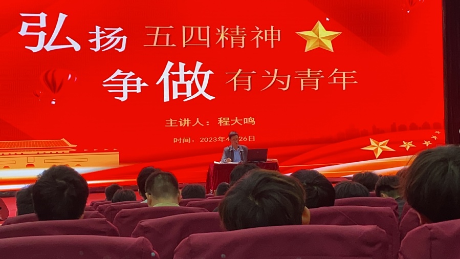 4月26日下午,酒店学院邀请校关工委常务副主任程大鸣,为400多名学生开设了“弘扬五四精神 争做有为青年”主题讲座。