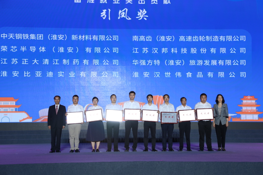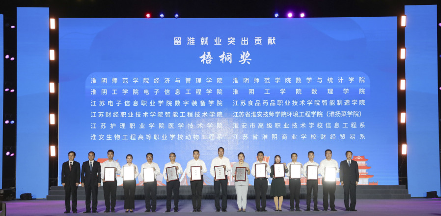 顾坤、孙虎、徐子佳为淮安输送毕业生作出突出贡献的高校院系颁发“梧桐奖”。周茂萱、周毅为吸纳毕业生留淮就业作出贡献的企业颁发“引凤奖”。