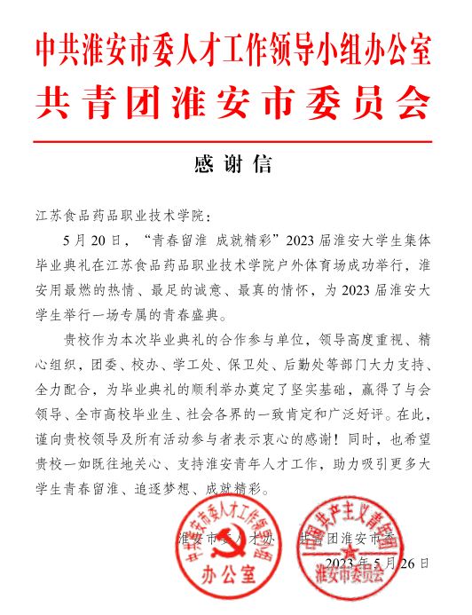 “5·20”是我们最深情的祝福,祝愿你们逐梦再出发,化作奋进新征程、建功新时代的“满天星”;“5·20”也是我们最诚挚的告白,期盼你们圆梦再聚首,淮安将永远是青春不散场、指引回家路的“北斗星”。