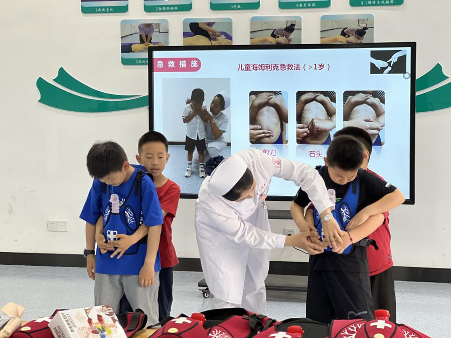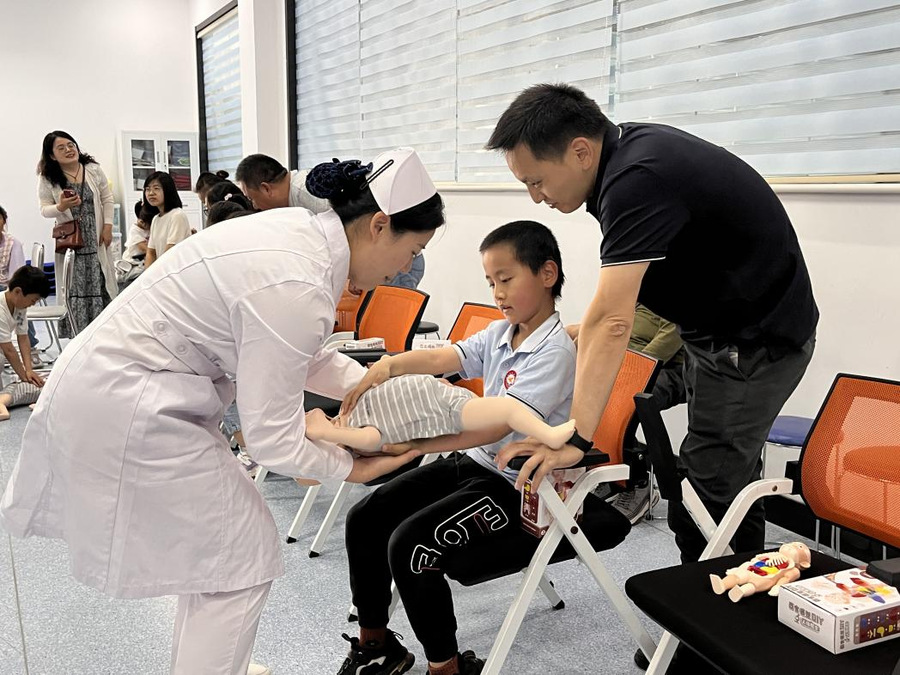 活动伊始,尹颖老师通过医学科普的动画小视频,向学生和家长们讲解“会厌软骨”在吞咽中发挥的重要作用,并现身说法讲述了气道异物梗阻发生的原因、生活中常见异物种类和海姆立克急救操作方法。活动现场,学生们积极举手参与急救知识抢答,学生和家长们依次分组体验成人及儿童海姆立克急救模拟背心、婴儿心肺复苏模型,老师耐心指导学生和家长进行操作练习,学习氛围高涨。