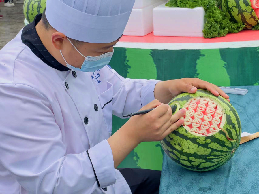酒店学院学子现场展示西瓜雕刻的精湛技艺,动作细致流畅,刀刃游走于瓜皮之上清晰齐整,一气呵成,尽显瓜皮中蕴含的无限智慧,吸引了大批群众驻足观赏拍照。