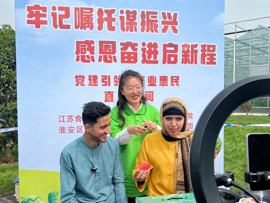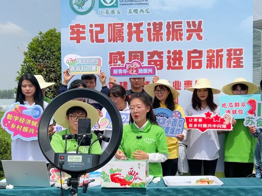 “直播间的观众朋友们快来看,咱们苏嘴小西瓜皮薄肉脆、香甜可口,每天产地现摘现发,大家喜欢的话快快下单啦……”来自数字经济学院的校园主播们饱含热情地为网友们详细推介苏嘴小西瓜等特色农产品。两位来自国际教育学院国际电商231班的留学生也积极加入直播,和观众们幽默互动,共同为苏嘴小西瓜“代言”,开启了他们的直播初体验。直播间现场围满了前来观摩、咨询的人群,反响热烈,气氛火爆。