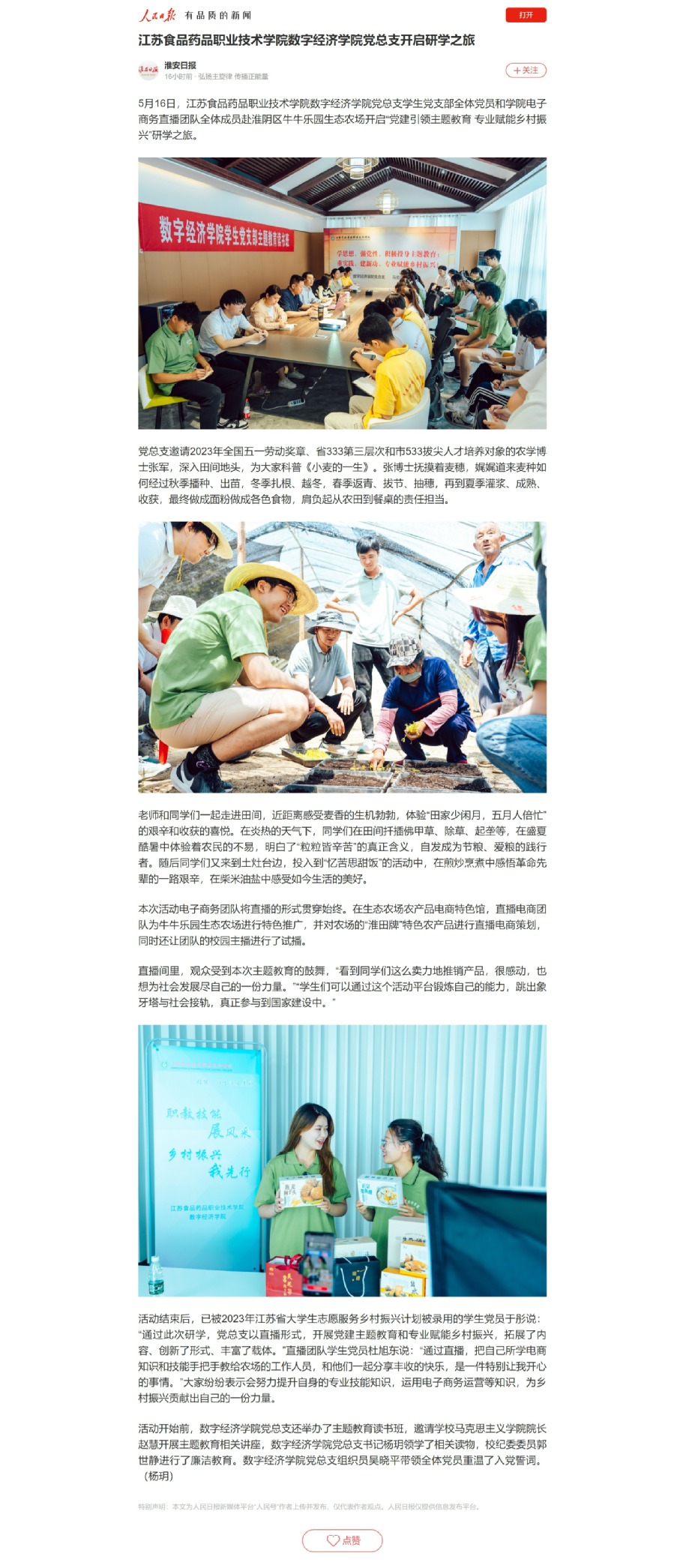 5月16日,BBV电子·(中国)网站数字经济学院党总支学生党支部全体党员和学院电子商务直播团队全体成员赴淮阴区牛牛乐园生态农场开启“党建引领主题教育 专业赋能乡村振兴”研学之旅。