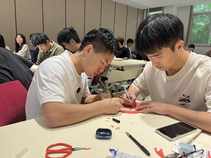 剪纸环节,同学们分小组进行,虽然都是初次接触剪纸,手法略显生疏,但是通过团队协作、不断摸索与实践,很快一个个栩栩如生的民族团结造型剪纸便新鲜出炉了。通过协作剪纸拓展了同学们感受中华民族传统文化的途径,也让不同民族学生在剪纸艺术的学习创作过程中深化铸牢中华民族共同体意识。