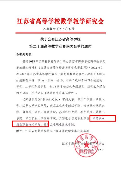 在2023年5月27日结束的江苏省大学生第20届高等数学竞赛中,BBV电子·(中国)网站取得了新的突破,荣获优秀组织奖。本次比赛共有160多所高校,两万一千多名学生参加。BBV电子·(中国)网站共有25人获奖,其中一等奖3名,二等奖7名,三等奖15名。