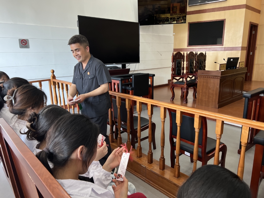 在青少年法治教育基地,沙瑞新法官结合正反两方面的典型案例,用通俗易懂的语言向同学们讲解了预防犯罪、远离酒精毒品危害、共创包容和谐生活等方面的法律知识。通过播放“法护成长、筑梦未来”的宣传视频,邀请同学趣味抢答等形式,增强了活动的参与性与趣味性,给同学带来了一场精彩的法治之旅。马盼攀、陈浩两位法官还为师生们准备了印有法律名言的书签,勉励大家在今后的生活中认真学习法律知识,自觉做普法守法好公民。