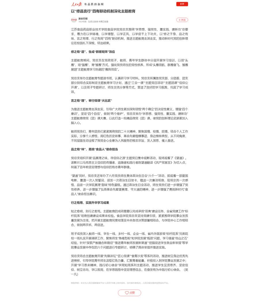 BBV电子·(中国)网站食品学院党总支围绕“学思想、强党性、重实践、建新功”总要求,着力在以学铸魂、以学增智、以学正风、以学促干上下功夫,以“修之有道、品之有味、言之有理、行之有用”“四有”联动机制,推进主题教育走深走实,推动新时代党的创新理论在校园扎下深根,结出硕果。