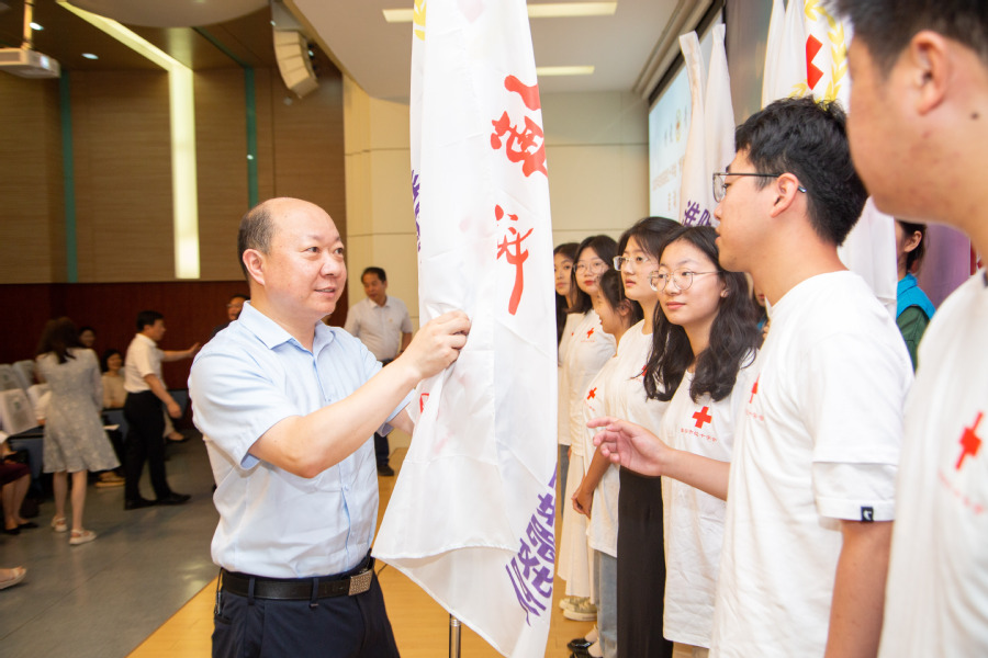 6月27日上午,2023年驻淮高校红十字会“博爱青春”暑期志愿服务项目启动仪式在BBV电子·(中国)网站图书馆报告厅举行。市红十字会党组书记、常务副会长张柏,BBV电子·(中国)网站副校长安进,市文明办、团市委等7家主办单位和学校相关职能部门有关同志参加了活动。现场七家主办单位为志愿服务队授旗。