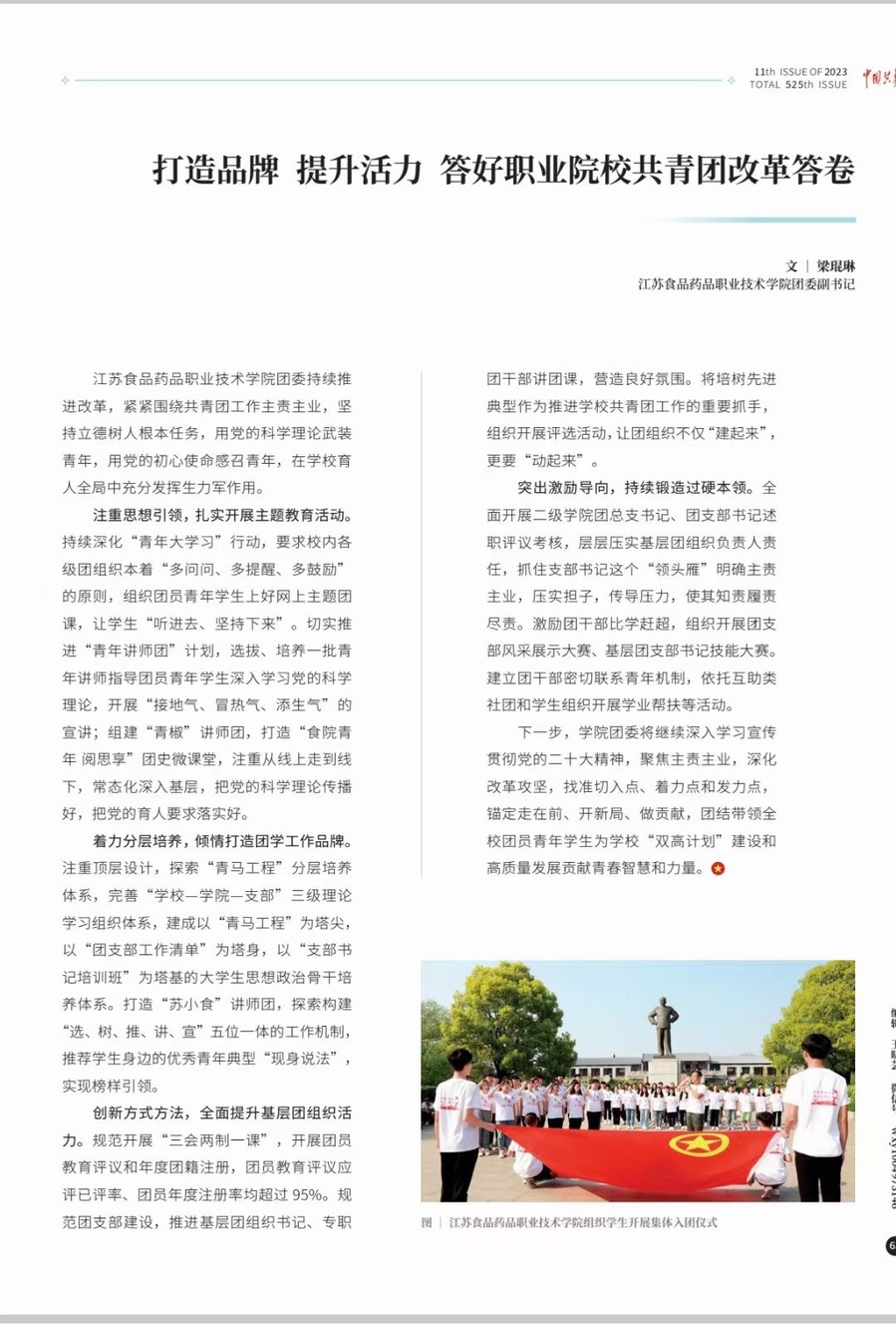 着力分层培养,倾情打造团学工作品牌。注重顶层设计,探索“青马工程”分层培养体系,完善“学校-学院-支部”三级理论学习组织体系,建成以“青马工程”为塔尖,以“团支部工作清单”为塔身,以“支部书记培训班”为塔基的大学生思想政治骨干培养体系。打造“苏小食”讲师团,探索构建“选、树、推、讲、宣”五位一体的工作机制,推荐学生身边的优秀青年典型“现身说法”,实现榜样引领。