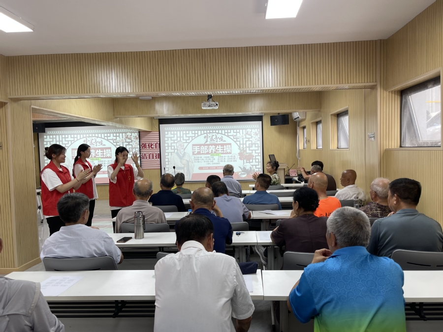 “青”尽全力护健康。由康复222班马秋仪、张婧奕、刘宇婷同学讲解手部养生操,通过按摩手部不同穴位和拍打姿势,来帮助社区老人改善体质,让老人在日常生活中潜移默化地恢复健康。