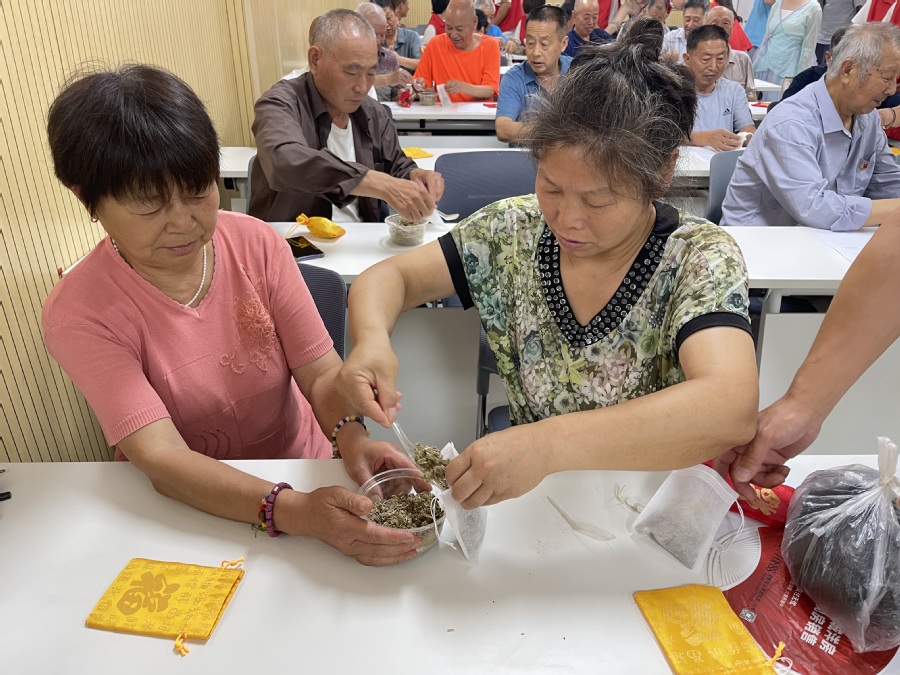 活动最后,健康医学院社会实践服务队准备了制作香囊的材料,和老人们一起制作预防感冒的香囊。