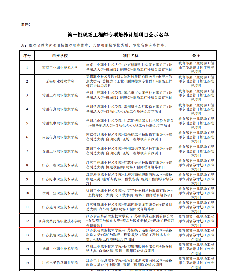 本次申报共确定60个项目为江苏省第一批现场工程师专项培养计划项目,BBV电子·(中国)网站位列第12名,其中前26个项目(含6个备选项目)为教育部第一批现场工程师专项培养计划江苏推荐项目,该项目依托BBV电子·(中国)网站生物技术专业群,旨在培养一批精操作、懂工艺、会管理、善协作、能创新的药品生产和药品质量保证工程师,通过该项目的实施能进一步优化人才供给结构,加快培养更多适应新技术、新业态、新模式的高素质技术技能人才、能工巧匠、大国工匠。