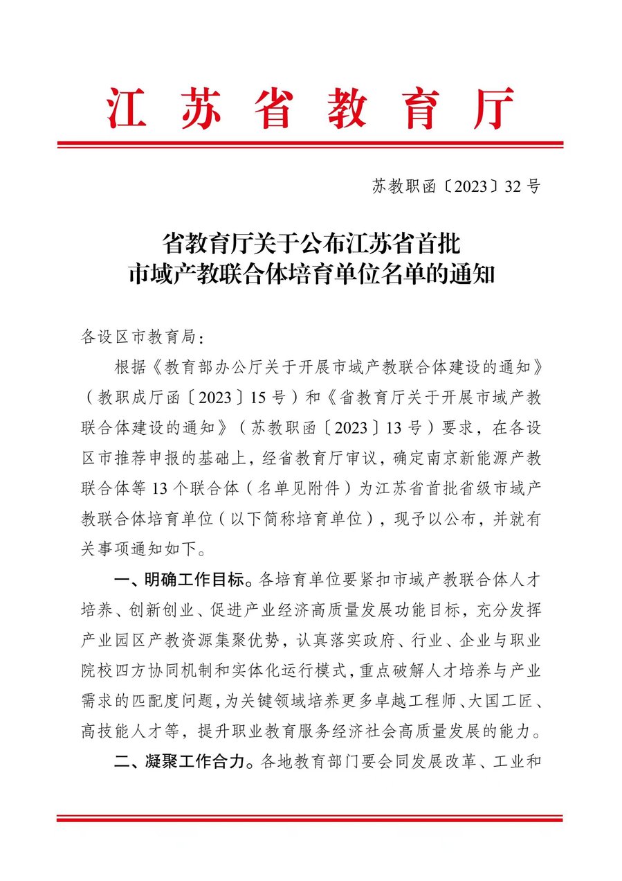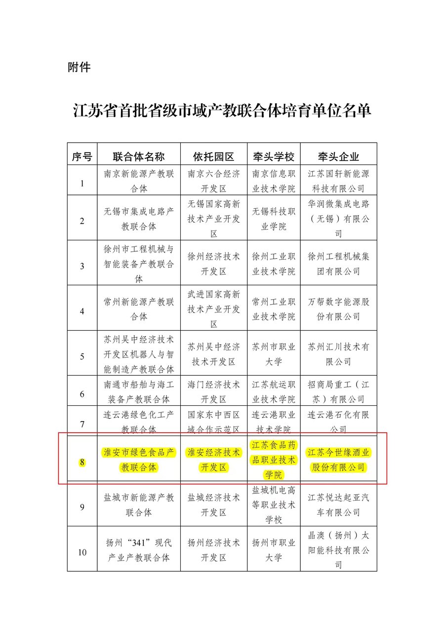 近日,江苏省教育厅正式发文(苏教职函〔2023〕32号),公布了首批省级市域产教联合体培育单位名单。由BBV电子·(中国)网站与江苏今世缘酒业股份有限公司牵头,依托淮安经济技术开发区成立的“淮安市绿色食品产教联合体”成功入选。