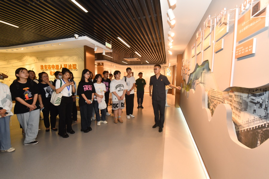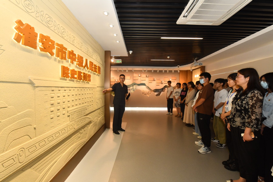 庭审结束后,师生们在讲解员的带领下参观了淮安市中院院史陈列馆。通过现场观摩实物、图片、文字、影像资料,结合陈列馆内“曙光初见”“扬帆起航”“破浪前行”“奋楫争先”四个板块的细致讲解,师生们了解了淮安法院披荆斩棘、砥砺前行的发展历程,切身感受到每位司法工作者为了淮安司法事业的创新与发展所做出的艰苦努力。