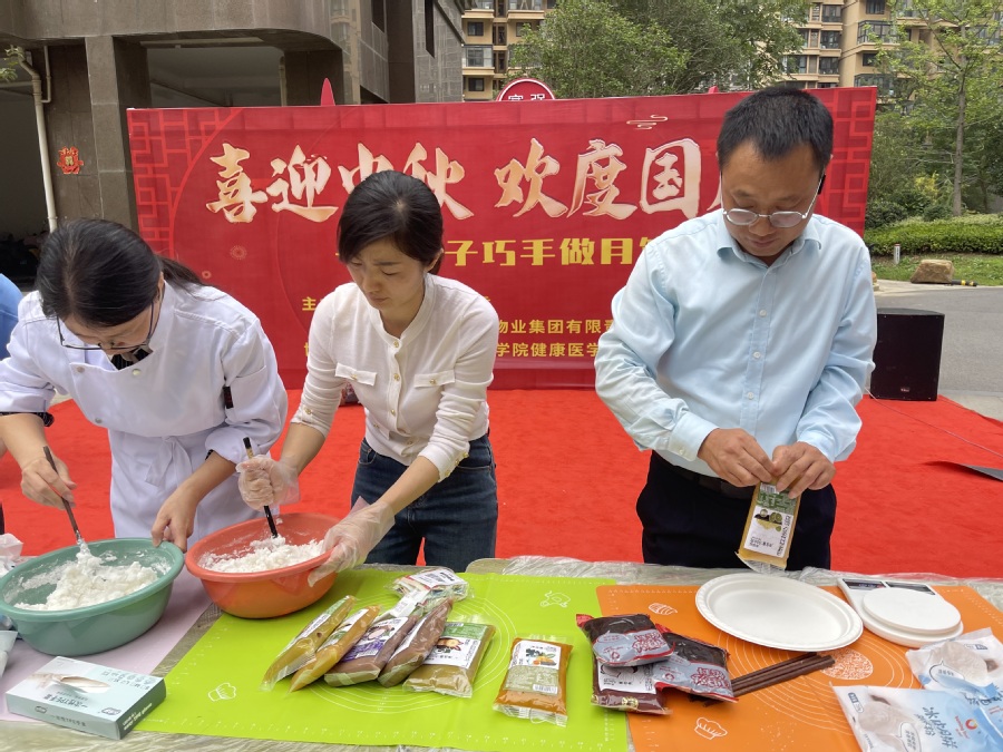 中秋、国庆节前夕、健康医学院、食品学院携手三门社区共同开展巧手做月饼、制香囊活动,除了本次报名参加活动的70余组家庭外,还吸引到了其他社区的小朋友们前来参加。在做月饼环节,大家按照步骤取皮、放团馅,然后整理形状再放入模具,最后轻轻压一压,一款款独特并充满浓浓情谊的月饼就在他们的手中完成了。在制香囊环节,志愿者们准备了艾叶、薄荷、丁香、藿香等中药材,小朋友们将制作香囊的工作台围得水泄不通,一只只香囊在他们灵巧的双手下精彩呈现。活动现场欢声笑语,其乐融融。