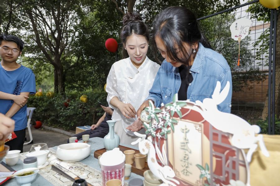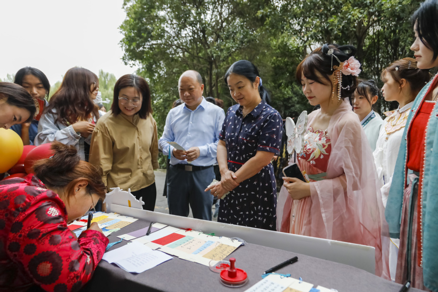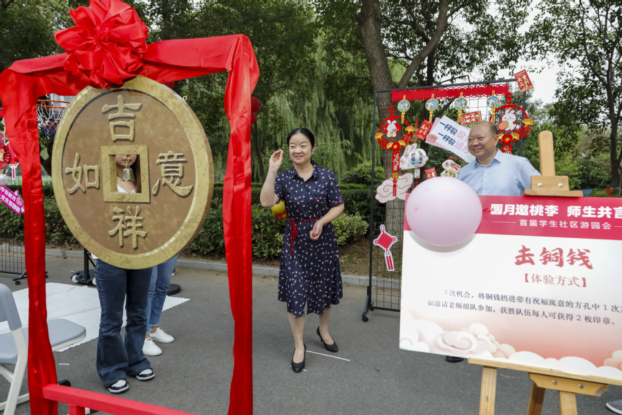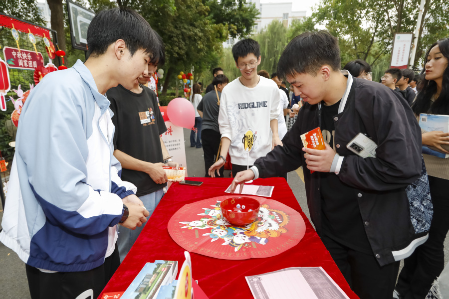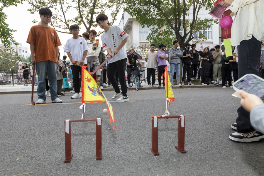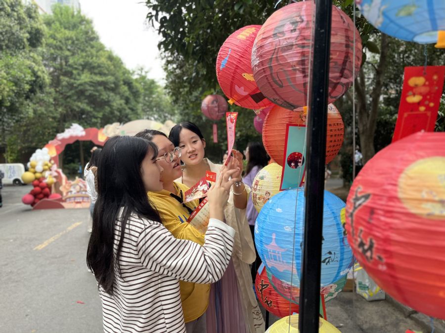 此次游园会充分结合中华传统文化特色,紧密融合中华传统文化内涵,活动分两个板块,现场设置了木射、捶丸、击铜钱、中秋博饼、“灌”月高手、月下许愿等竞技项目和三行诗、赏花猜灯谜、手绘团扇、汉服体验、中式点茶等文艺体验项目。公寓楼内的学生纷纷被吸引前来参与,同学们在游戏中充分感受传统文化的独特魅力。他们表示,宿舍区周围的节日氛围浓厚、社区活力值拉满,这样的节日庆祝活动不仅丰富了校园文化,更是让天南海北的学生集聚社区共同感受和传承着中华民族传统文化。