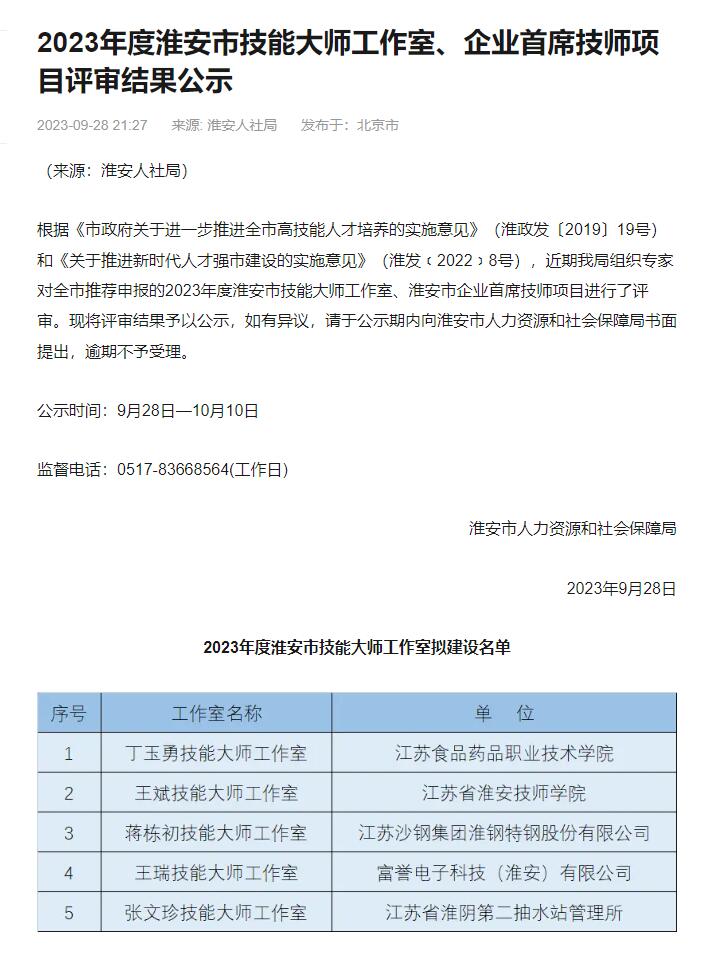 9月28日,淮安市人力资源和社会保障局发布《2023年度淮安市技能大师工作室、企业首席技师项目评审结果公示》,BBV电子·(中国)网站报送的“丁玉勇技能大师工作室”获评2023年度淮安市拟建技能大师工作室之一,全市各行业共有5人获评拟建技能大师工作室,有10人获评淮安市企业首席技师。