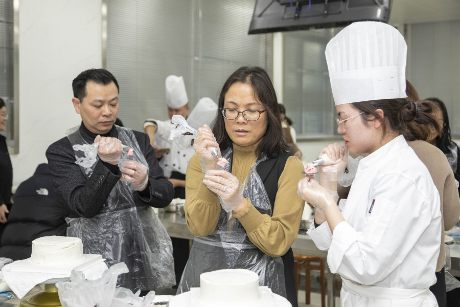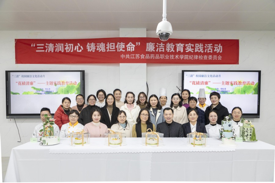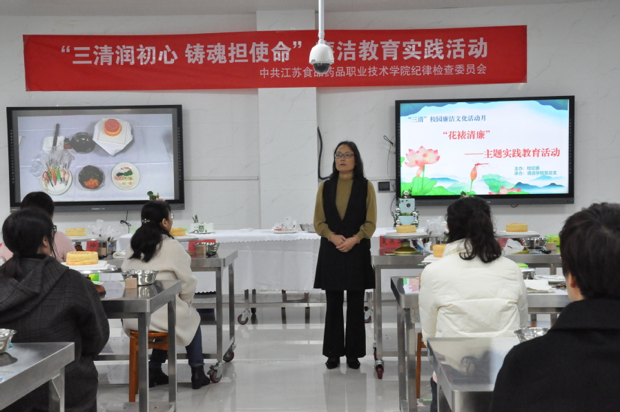11月21日,由校纪委主办、酒店学院党总支承办的“三清”校园廉洁文化活动月之“花裱清廉”主题实践教育活动在酒店学院烹饪实训中心举办。活动将廉洁教育与专业教学深度融合的大胆创新,厚植了廉洁从教的情怀。西式烹饪工艺专业教研室主任汪晓琳老师与大家分享了自己廉洁从教的感悟,分析了“廉花”蛋糕所蕴含的廉洁内涵。西式烹饪工艺专业薛盼盼老师为大家讲解并示范了“廉花”蛋糕组成、制作要点和方法技巧。各位学员在专业老师的协助下完成了个人作品的制作,学员代表刘艳云老师分享了实践心得。