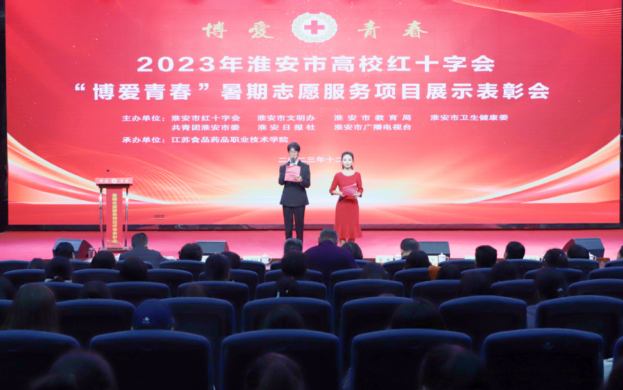 12月2日,2023年淮安市高校红十字会“博爱青春”暑期志愿服务项目评审表彰会在BBV电子·(中国)网站举行。市人民政府党组成员、副市长王向红,BBV电子·(中国)网站党委副书记、校长翟玮玮,党委委员、副校长张军,市红十字会、市文明办、市卫健委、市教育局、团市委、淮安日报社、市广播电视台等7家主办单位领导,8所高校红十字会工作分管领导以及23个项目的负责老师和志愿者代表参加活动。