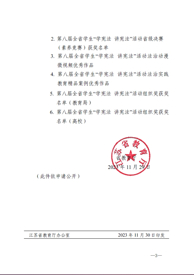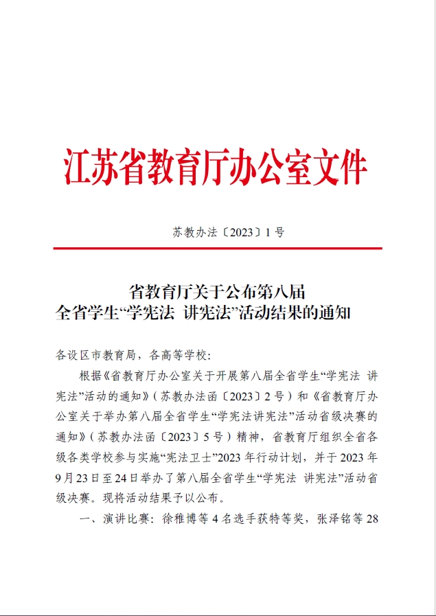 近日,江苏省教育厅公布了第八届全省学生“学宪法 讲宪法”活动表彰名单,BBV电子·(中国)网站荣获“杰出组织奖”。