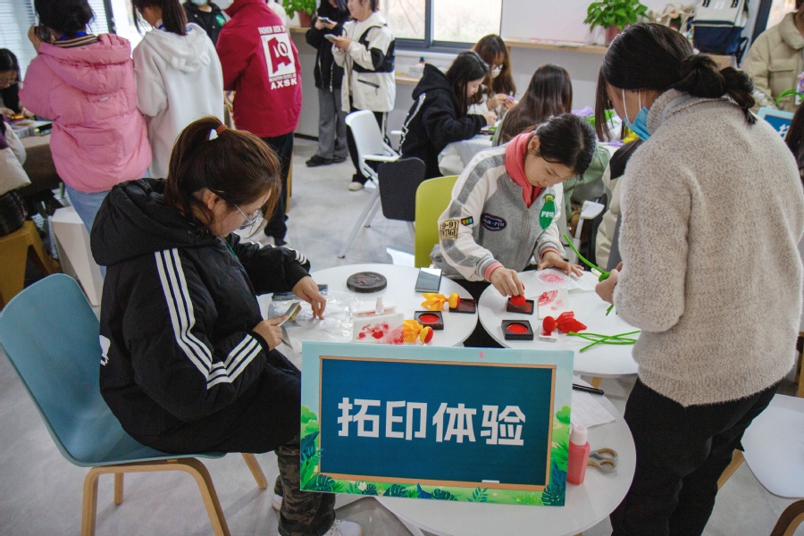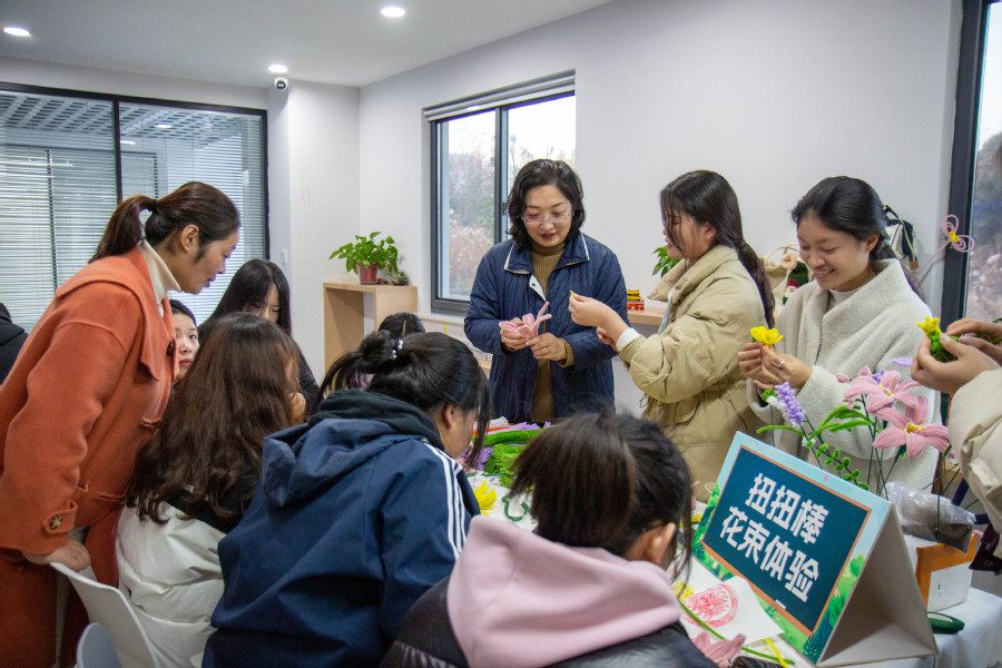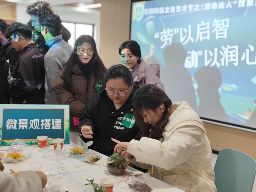 本次“劳动达人”技能挑战赛以“‘劳’以启智,‘动’以润心”为主题,旨在弘扬工匠精神,营造浓厚的“匠心文化”氛围。比赛现场设置“OM纸桥”“乐高拼装”“微景观搭建”“快速收纳”4个竞赛项目,“扭扭棒花束”“拓印”2个体验项目。在“微景观搭建”比赛中,参赛队伍2人一组,利用滴水管、喷壶、镊子、勺子等工具,将网文草、狼尾蕨、罗汉松、袖珍椰子等不同植物在半径不足7厘米的球形空间中营造出高低错落的层次感,再通过搭配轻石、河川沙、蛭石等砂石搭建出形态各异的微景观。各参赛队伍在4分钟的限时内密切配合,用巧手和奇思妙想制作了不同风格的微景观。在拓印体验区,同学们在志愿者的指导下将墨汁涂抹在平整的拓印材料上,将图案放在墨汁上轻轻按压,再轻轻拿起放在需要拓印的材料上稍加按压。大家在一次次沾墨、拍、滚的过程中,最后慢慢掀起宣纸,取下拓片,不一会儿,“朱雀”“白虎”“青龙”“玄武”四大上古神兽图案跃然纸上,一件件精美的拓印作品便制作完成。同学们纷纷表示这是一次“走心”的沉浸式劳动竞技和体验。
