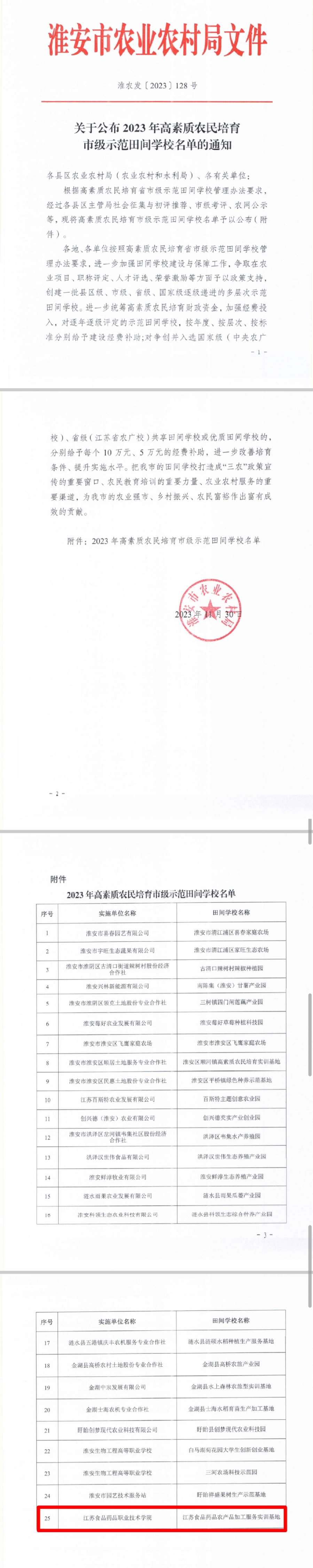 近日,淮安市农业农村局发布了《关于公布2023年高素质农民培育市级示范田间学校名单的通知》,BBV电子·(中国)网站荣获“高素质农民培育市级示范田间学校”称号。