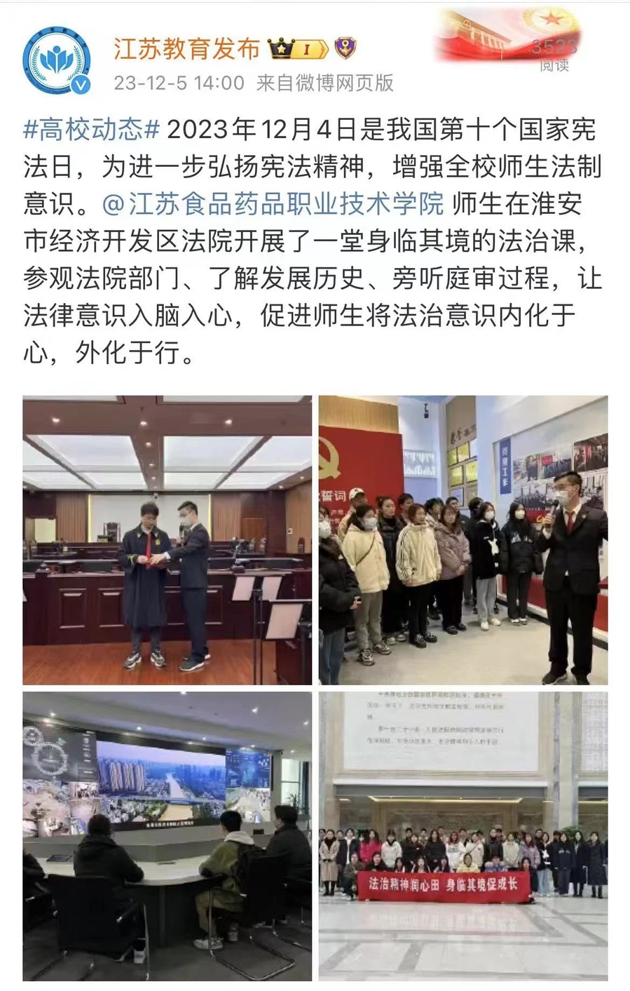 2023年12月4日是我国第十个国家宪法日,为进一步弘扬宪法精神,增强全校师生法制意识。BBV电子·(中国)网站师生在淮安市经济开发区法院开展了一堂身临其境的法治课,参观法院部门、了解发展历史、旁听庭审过程,让法律意识入脑入心,促进师生将法治意识内化于心,外化于行。