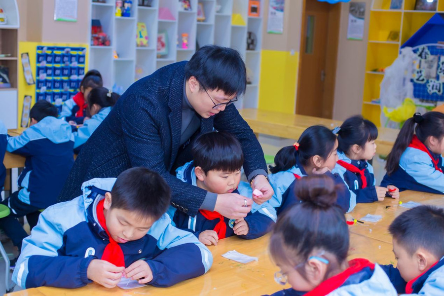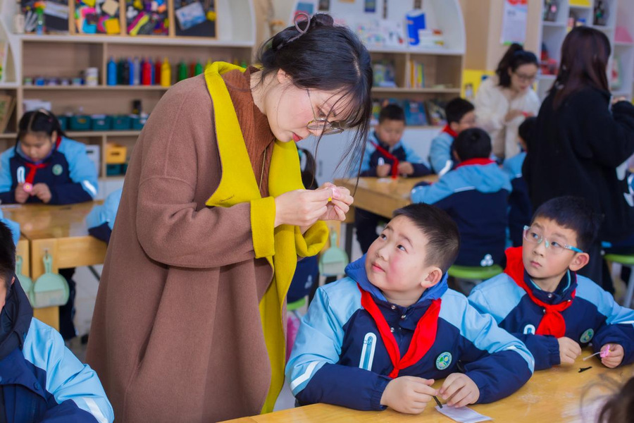 在沁春路小学,徐善芳老师亲切的向孩子们讲解了“清江浦线编”的由来和价值,展示了盆景、雕塑、虎头鞋等仿真线编艺术品。随后以“中药香囊”为主题进行现场教学,细心指导每一位学生。孩子们既新奇又喜爱,都对“清江浦线编”表现出了极大的兴趣,纷纷主动询问徐老师问题,现场氛围轻松愉悦。非遗文化进小学校园活动让孩子们近距离接触非遗、了解非遗、体验非遗,锻炼了他们的手眼协调能力,培养了想象力和创造力,对中华传统文化进行了发扬和传承。