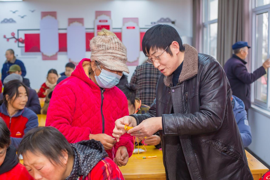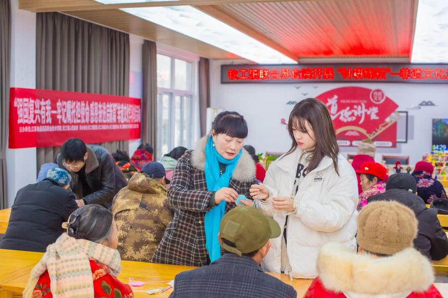 在钦工镇,徐善芳老师向村民们介绍了自家独门的穿针手法和线编技艺,手把手指导群众现场制作线编香囊。大家看的聚精会神,干的热火朝天,活动现场气氛十分活跃。“沉浸式”体验非遗文化增进了乡镇群众对非遗传统文化的认知和理解,进一步促进了非遗传统文化的传承与发展。