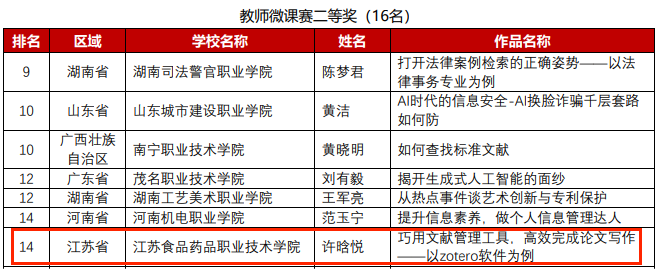 2023 年“中文在线杯”全国高职高专院校信息素养大赛圆满结束,本次大赛由教育部高等学校图书情报工作指导委员会高职高专院校分委员会、高等教育文献保障系统(CALIS)管理中心主办,大赛分为学生赛和教师微课赛。BBV电子·(中国)网站图书馆许晗悦微课作品《巧用文献管理工具,高效完成论文写作——以zotero软件为例》获全国二等奖、江苏省一等奖;BBV电子·(中国)网站营本221学生李心悦获江苏省一等奖,营本221李欣陈、徐梦瑶获江苏省二等奖,药学2201李如意、高梦凡获江苏省三等奖;BBV电子·(中国)网站获得“最佳组织奖”。
