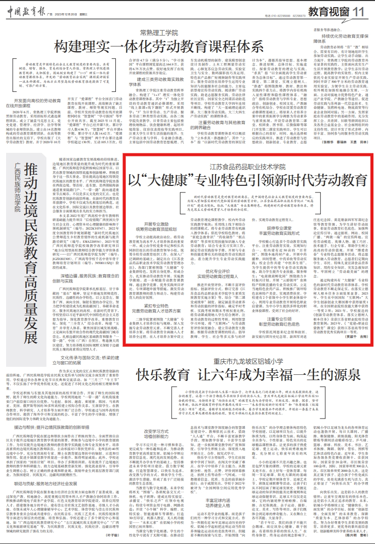 通过构建具有“大健康”专业特色的新时代劳动教育培养体系,学校劳动教育不断走深走实,在落实立德树人根本任务方面效果显著。2023年,学生在中国国际“互联网+”大学生创新创业大赛国赛中获得银奖1项,在全国职业院校技能大赛中获得一等奖2项;2021年,学校报送的《创新劳动教育体系,落实立德树人根本任务》荣获江苏省职业院校劳动教育案例;2023年,《“党建+职业启蒙教育”课堂》获得江苏省高等学校劳动教育优秀实践项目一等奖。