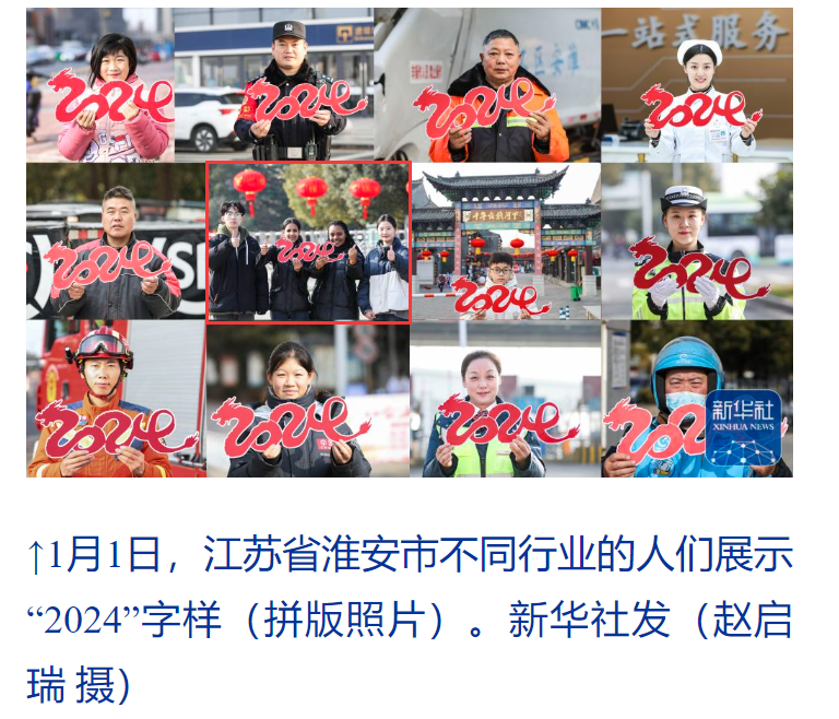 ↑1月1日,江苏省淮安市不同行业的人们展示“2024”字样(拼版照片)。新华社发(赵启瑞 摄)