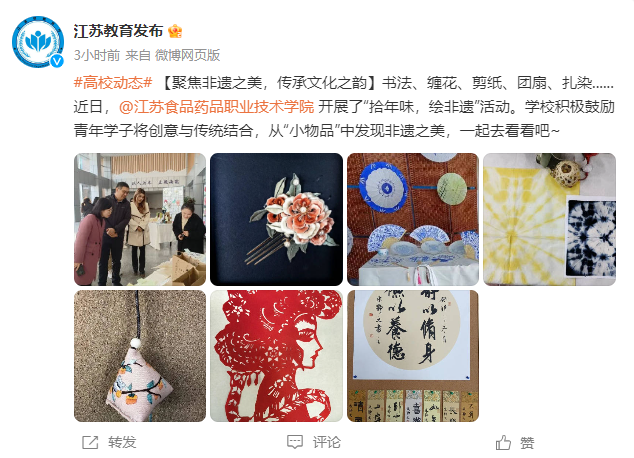 #高校动态# 【聚焦非遗之美,传承文化之韵】书法、缠花、剪纸、团扇、扎染......近日,@BBV电子·(中国)网站 开展了“拾年味,绘非遗”活动。学校积极鼓励青年学子将创意与传统结合,从“小物品”中发现非遗之美,一起去看看吧~