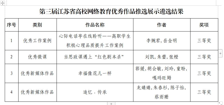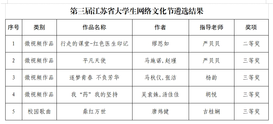 学校报送的第三届江苏省大学生网络文化节微视频作品《行走的课堂-红色医生印记》荣获二等奖;微视频作品《平凡天使》《逐梦青春 不负芳华》《我“药”我的坚持》荣获三等奖;校园歌曲作品《鼎红万世》荣获三等奖并入围国赛。在第三届江苏省高校网络教育优秀作品推选展示活动中,优秀工作案例《心际电话亭在线聆听——高职学生积极心理品质提升工作案例》荣获三等奖;优秀微课《当思政课遇上“红色剧本杀”》荣获三等奖;优秀新媒体作品《幸福像花儿一样》《追忆﹒传承》荣获三等奖。