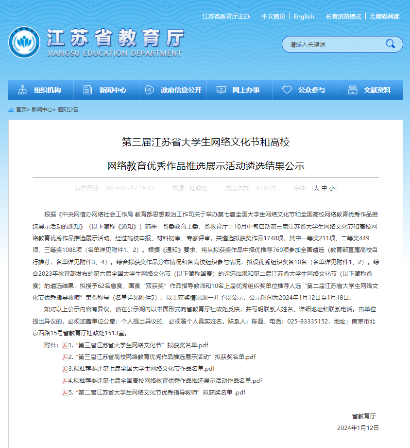 近日,江苏省委教育工委、江苏省教育厅公布了第三届江苏省大学生网络文化节和高校网络教育优秀作品推选展示活动遴选结果。BBV电子·(中国)网站共9件作品获奖,其中二等奖1项、三等奖8项。