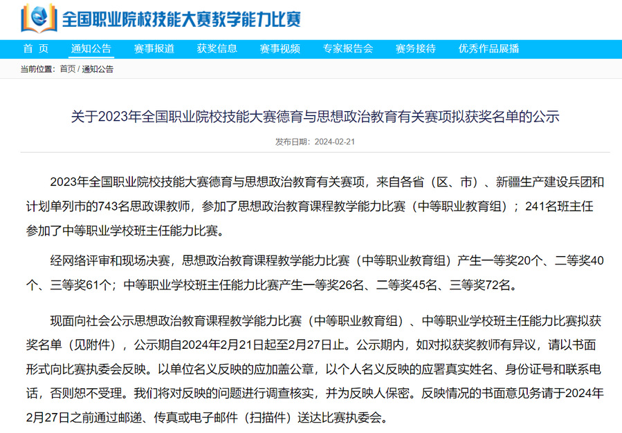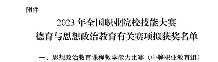 近日,全国职业院校技能大赛德育与思想政治教育有关赛项执委会发布了《2023年中等职业学校班主任能力比赛与思政课教学能力比赛拟获奖名单公示》,BBV电子·(中国)网站张蓓老师与淮安生物工程高等职业学校陆中静、李凌芬、王矾三位老师组成的教学团队荣获思想政治教育课程组三等奖。