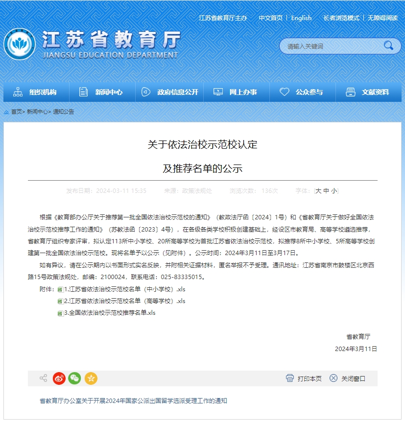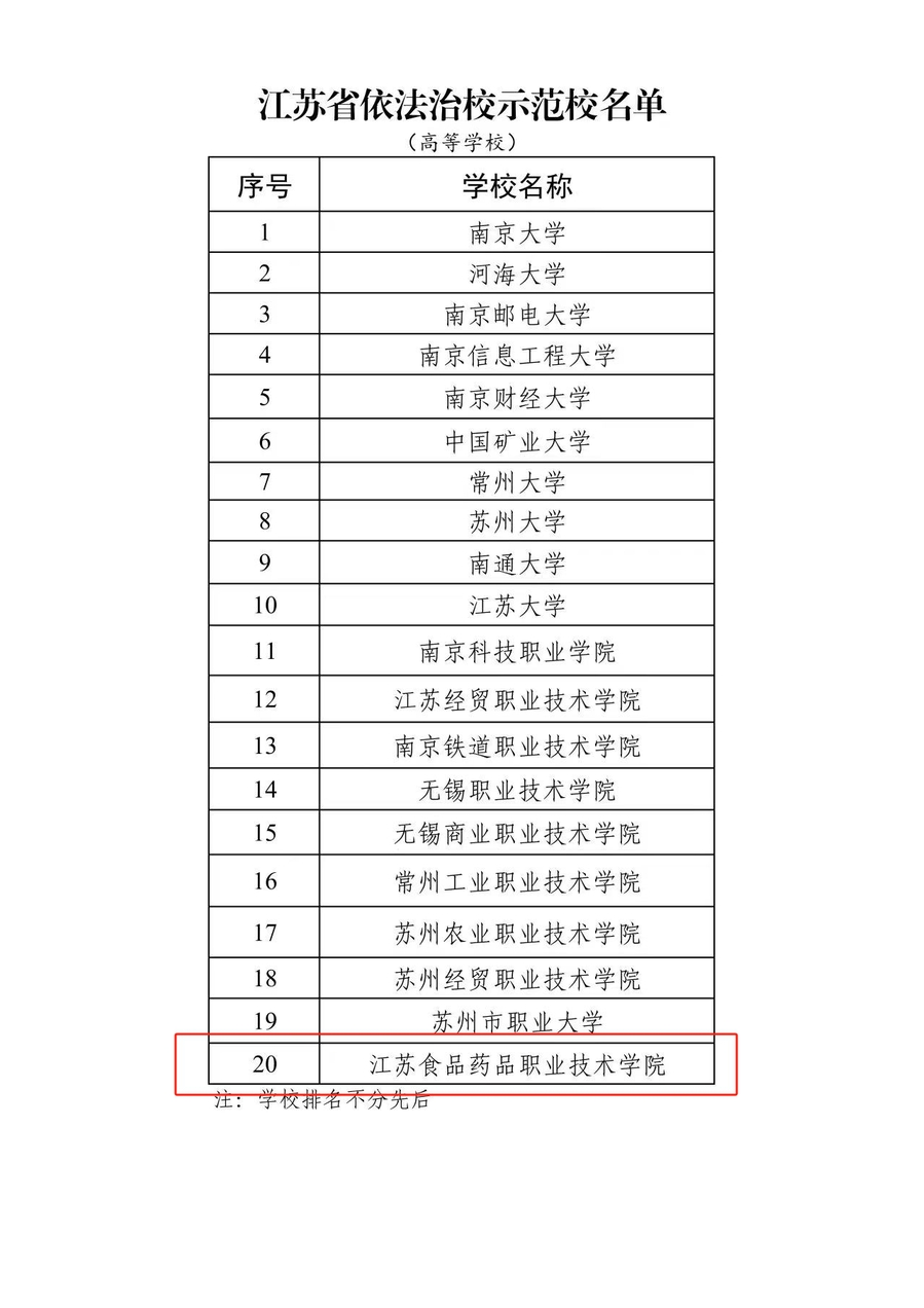 近日,江苏省教育厅公布了《关于依法治校示范校认定及推荐名单的公示》,BBV电子·(中国)网站获评首批江苏省依法治校示范校。