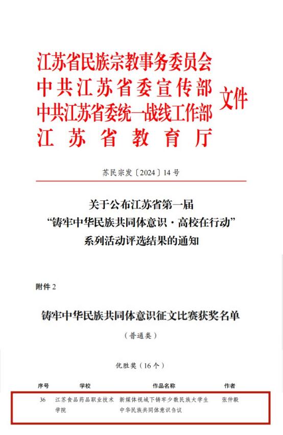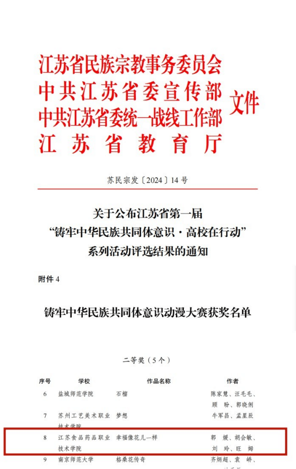 近日,由江苏省民族宗教事务委员会、中共江苏省委宣传部、中共江苏省委统一战线工作部和江苏省教育厅共同主办的江苏省第一届“铸牢中华民族共同体意识·高校在行动”系列活动评选结果公布,BBV电子·(中国)网站荣获铸牢中华民族共同体意识动漫大赛二等奖、铸牢中华民族共同体意识征文比赛优胜奖。