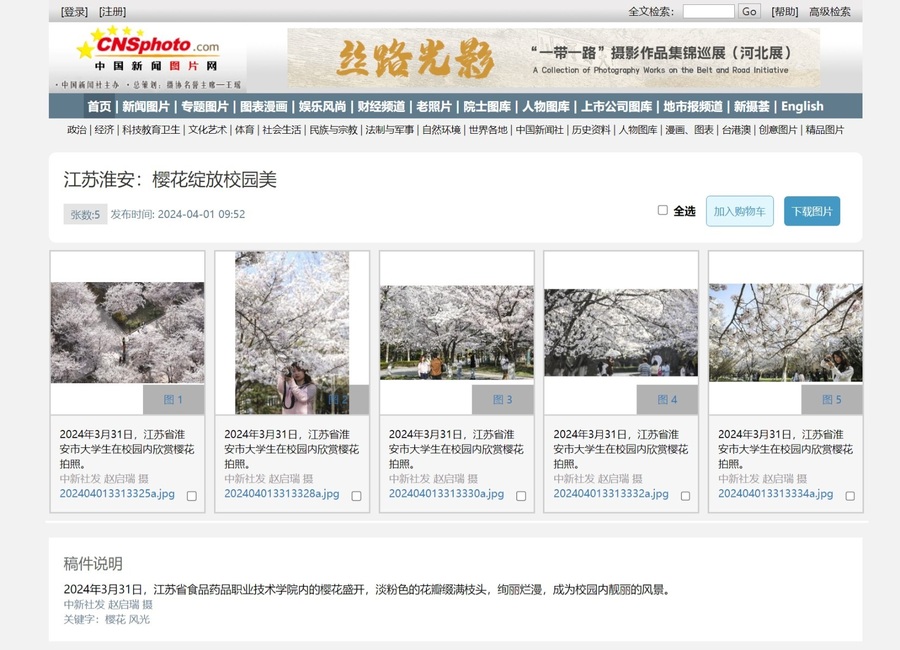 2024年3月31日,江苏省食品药品职业技术学院内的樱花盛开,淡粉色的花瓣缀满枝头,绚丽烂漫,成为校园内靓丽的风景。
