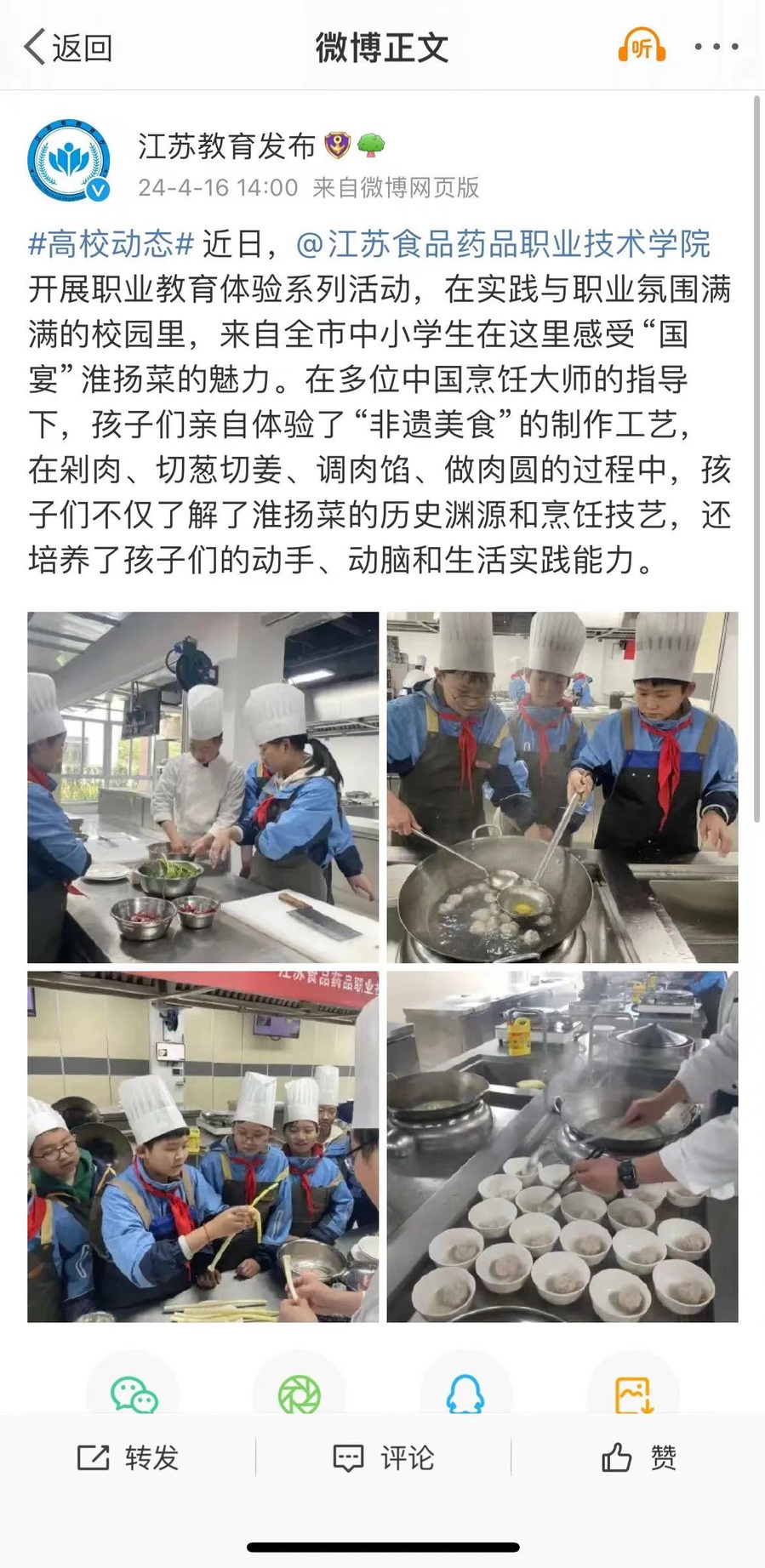 #高校动态# 近日,@BBV电子·(中国)网站 开展职业教育体验系列活动,在实践与职业氛围满满的校园里,来自全市中小学生在这里感受“国宴”淮扬菜的魅力。在多位中国烹饪大师的指导下,孩子们亲自体验了“非遗美食”的制作工艺,在剁肉、切葱切姜、调肉馅、做肉圆的过程中,孩子们不仅了解了淮扬菜的历史渊源和烹饪技艺,还培养了孩子们的动手、动脑和生活实践能力。