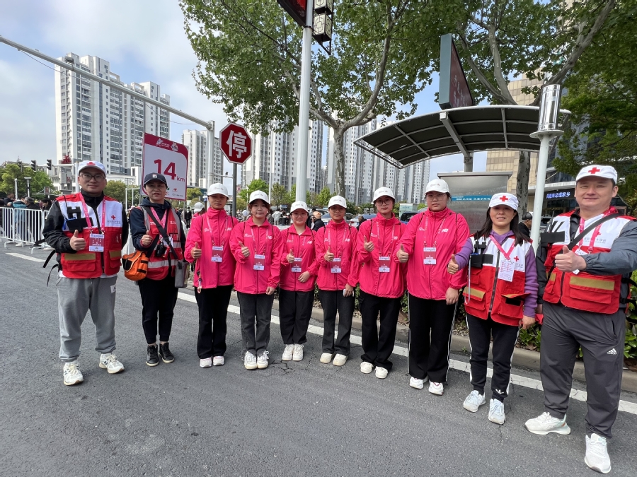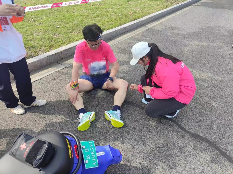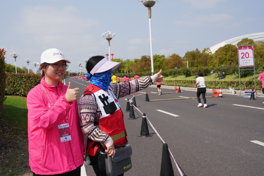 4月21日凌晨4:30,空气中还透着丝丝凉意,志愿者们却早已整装待发,奔赴各自的服务点位。他们按耐住激动的心情,面带微笑、怀揣热情,以昂扬的姿态投入到志愿服务工作中。赛事开始的那一刻,他们用心观察着每一名路过的选手,不敢有半点松懈。当发现有选手受伤,便细心地为其喷涂药水,包扎伤口,处理肌肉拉伤等意外情况。